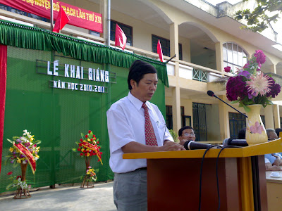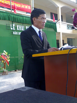Thầy Lưu Hùng Sơn Bí thư chi bộ, Hiệu trưởng nhà trường trịnh trọng báo cáo những thành tích đã đạt được trong năm học qua và phát động phong trào dạy và học trong năm học mới. |